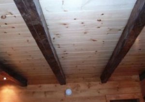 This cathedral ceiling is done in 5" and 6" pine with a natural finish. Matching trim around the window and door area highlights the total dramatic effect.