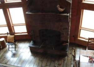 This bedroom loft not only has Newcombe's Original's wide plank flooring, but it also claims our stairs, railing, spindles, newel posts, and solid pine posts! These features are hand pealed and smoothed to a finish. If you look over the banister you will view the brick fireplace relaxing on Newcombe's Original's plank floors below. A dream home for sure!